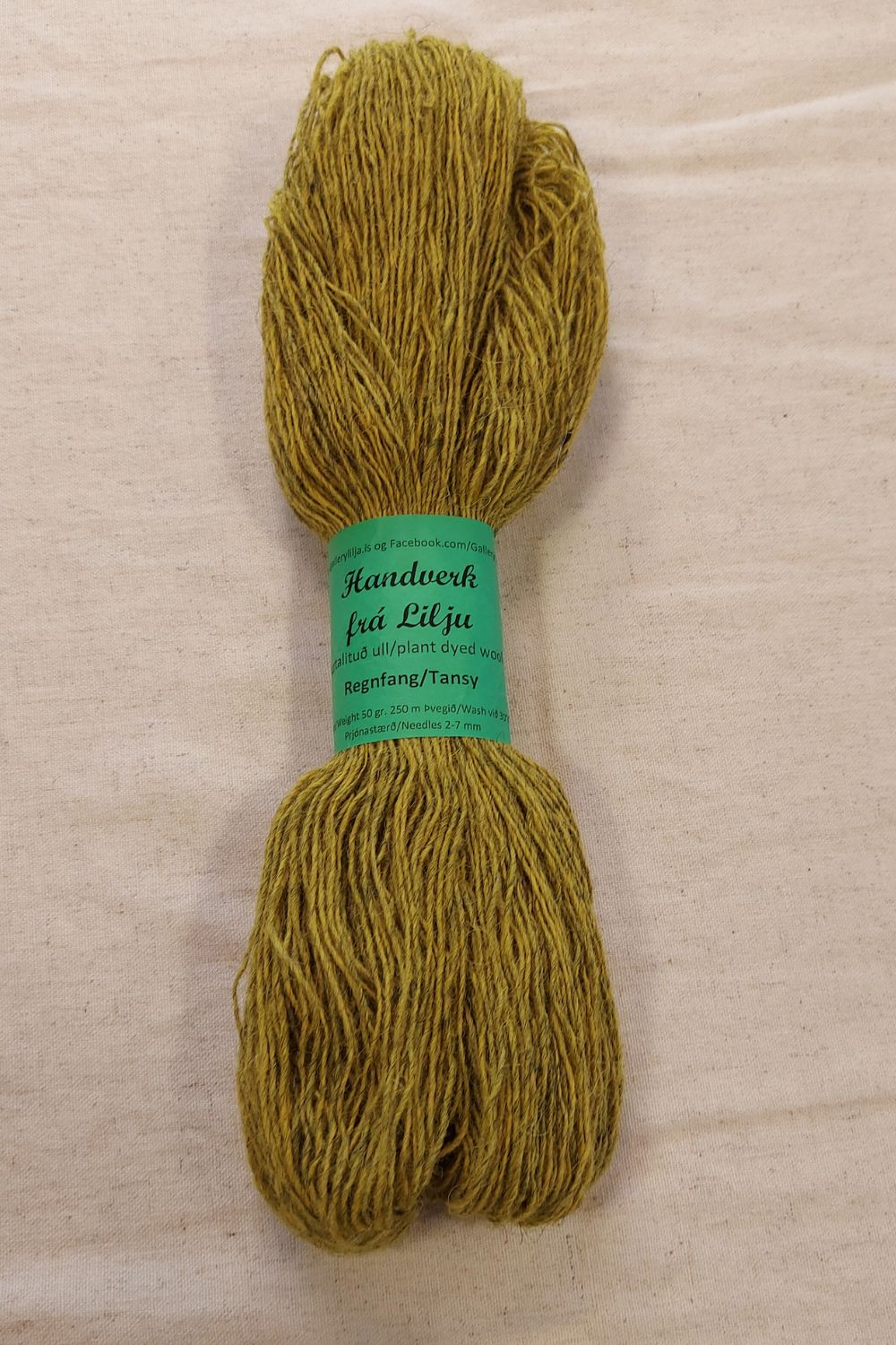 Regnfang (ramfang) (Tanacetum vulgare) gefur fallega gula liti og gulbrúna eða græna tóna þegar notaður er litbreytir svo sem kopar eða járn. Með yfirlitun með indigo fást fallegir grænir litir. Þessar hespur eru litaðar með regnfangi yfir grátt einband.